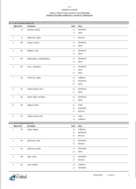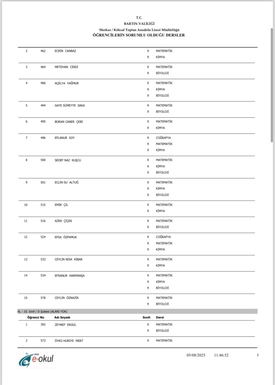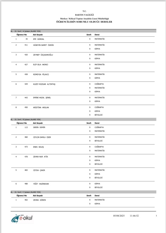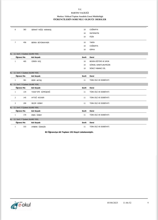 2025-2026 Öğretim Yılı 1. Dönem Başı Sorumluluk Sınavları 15-19 Eylül 2025 tarihlerinde yapılacaktır. Öğrencilerimiz, hangi derslerden sorumlu olduklarını E-Okul Veli Bilgilendirme ekranından giriş yaparak öğrenebilirler. Sınava katılacak olan beklemeli öğrencilerin, yönetmelik gereği, sınav tarihinden 1 hafta önce, sınavlara katılacaklarını okul idaresine bildirmeleri gerekmektedir. Aksi halde, beklemeli öğrenciler için sınav açılmayacaktır. Ayrıntılı sınav takvimi, sınavlardan 2 hafta önce okul web sayfasında duyurulacaktır.